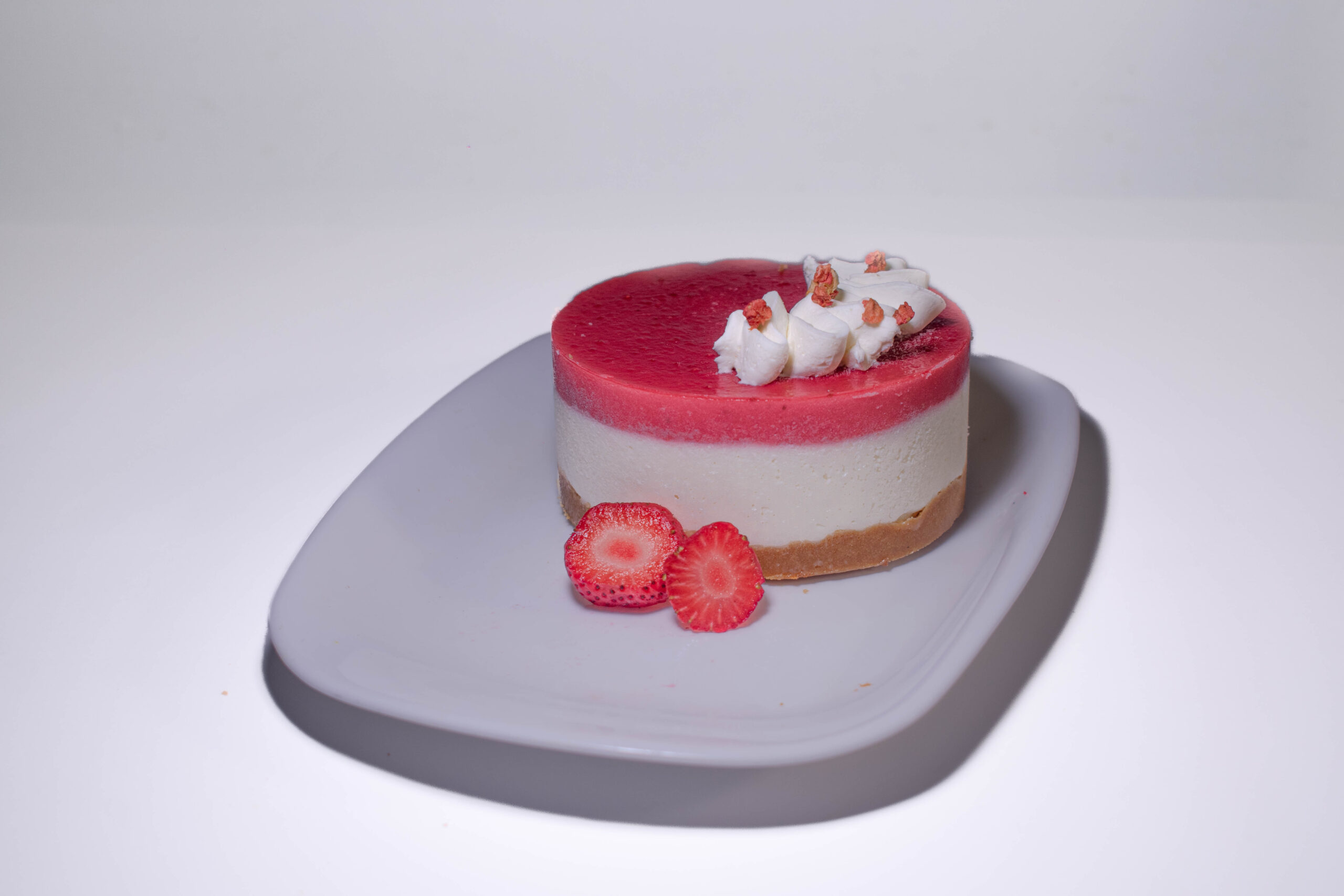 Cremosa crema de queso con fresas en su composición, cubierto de gelificado de fresa frescas sobre crujiente base de masa quebrada.