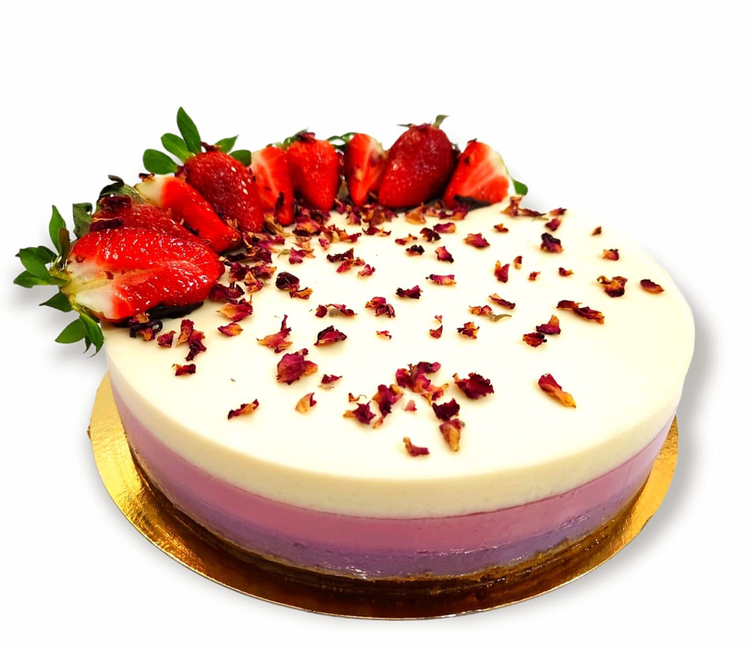 Tarta de queso combinada con frutas. Primer capa de queso y arándanos, segunda capa de frambuesa y queso; y ultima capa de queso y limón. Todo sobre base crujiente de galletas.